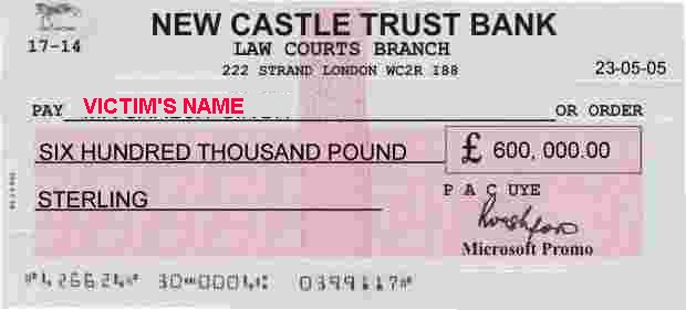 The street address is that of a Lloyds TSB bank branch. The fake image of check was edited from a scan of a Lloyds TSB check. That wasn't the end of it. The criminals thenm demanded £6000 to be paid by Western Union or into a bank account: From: "Todd Aaron" <todd_aronn@hotmail.com> To: <emailaddress> Sent: Friday, 03 June, 2005 2:49 Subject: Attn:title firstname lastname(ACCOUNT) British International Lottery Support Center Bevan House 51 Bevan Avenue Conwy LL28 5AF United Kingdom Attn:title firstname lastname Top of the day to you,This is the complet account details you requested and you can make the payment from your Bank and do not send any DRAFT because we don't accept it. As soon as you make the payment you are to send the payment slip. Am given you so many uption to make payment because i want you to get your check soonest. IBAN: GB21BARC20325360237140 SWIFTCODE: BARCGB22 BARCLAYS SORT CODE: 203253 ACCOUNT NUMBER: 60237140 FURTHER CREDIT TO, THE WOOLWICH BANK POWIS STREET WOOLWICH, LONDON A/C. NAME: MR.PHILLIP RADEBE A/C.NUMBER: 58471261 SORT CODE: 108002 Get back soon Regards Todd Aaron Message headers: Received: from 80.88.128.12 by by19fd.bay19.hotmail.msn.com with HTTP; Thu, 02 Jun 2005 17:49:47 GMT X-Originating-IP: [80.88.128.12] X-Originating-Email: [todd_aronn@hotmail.com] X-Sender: todd_aronn@hotmail.com